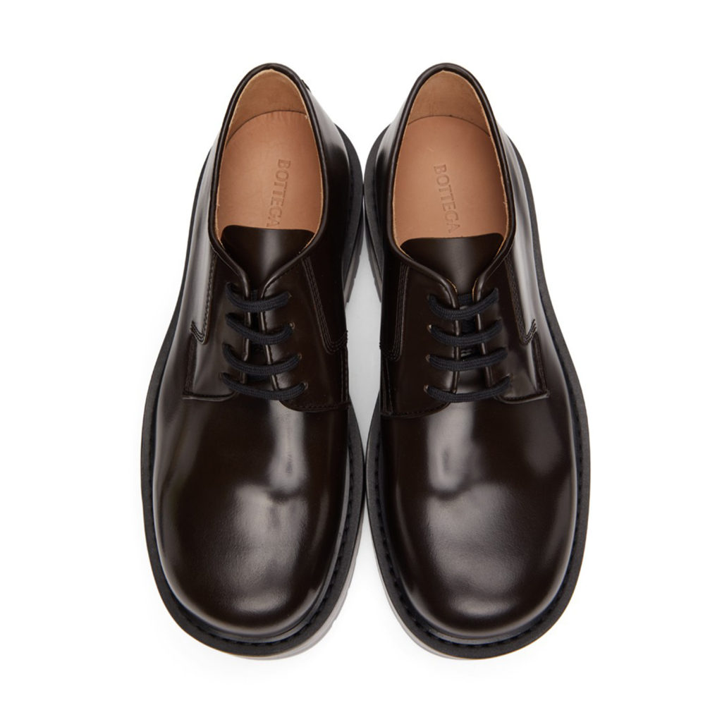 こちらは[Bottega Veneta®(ボッテガ・ヴェネタ)]のカーフスキンのロートップダービーシューズ。結構な厚底の作りになっていて、アウトソールだけがクリアになっているのが新鮮。