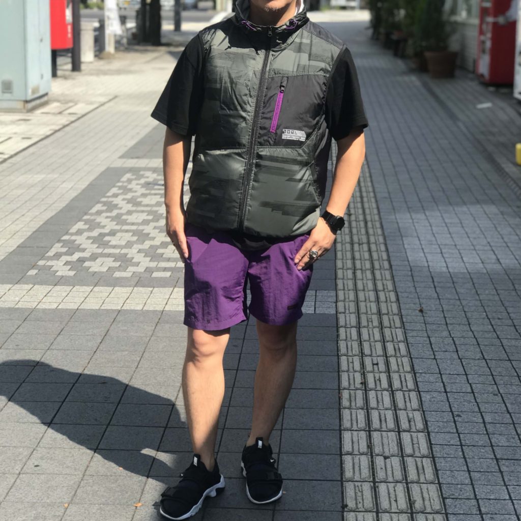 が、最近お気に入りの[GRAMICCI(グラミチ)]のパープルのショートパンツとの相性も良いので、自分の中では「アリ」にすることにしました!