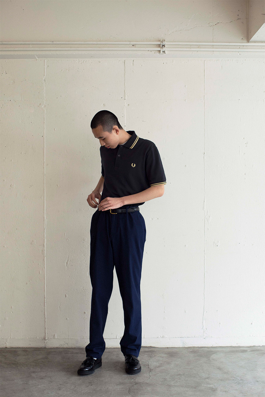 ポロシャツ ¥12,000+TAX、トラウザーズ ¥16,000+TAX (Fred Perry)、シューズ ¥26,000+TAX (Fred Perry × George Cox / すべてフレッドペリーショップ東京)