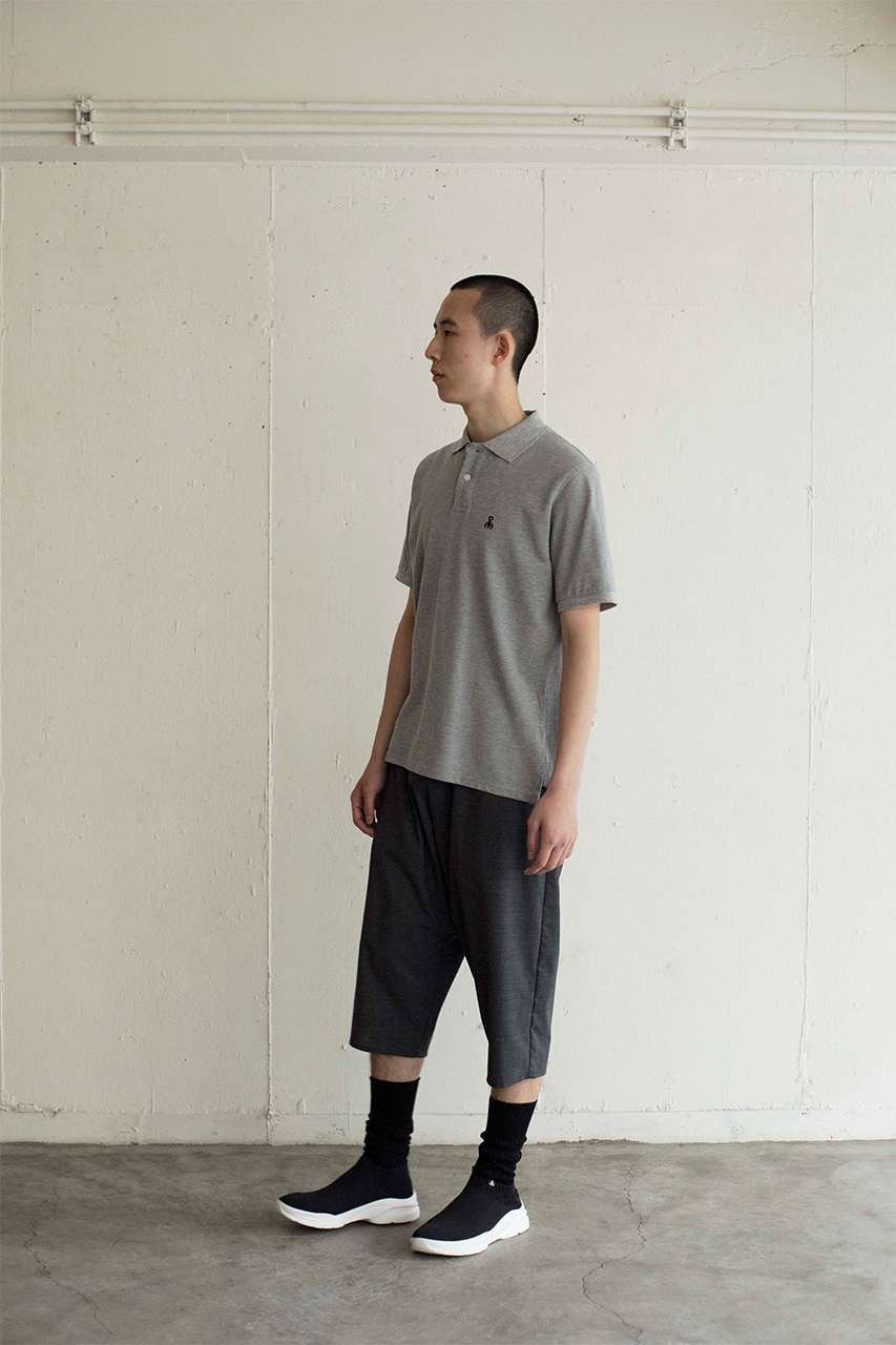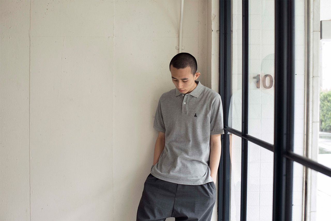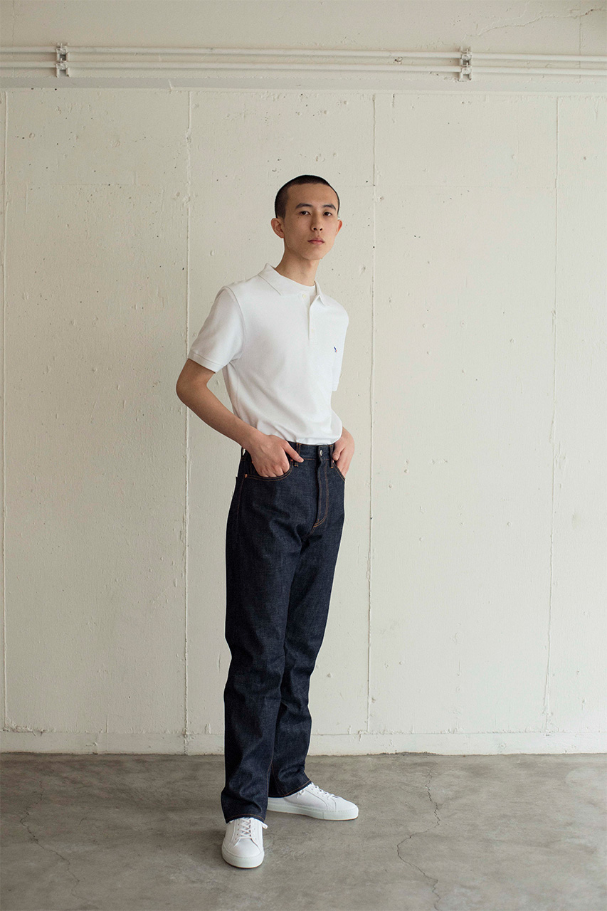 ポロシャツ ¥19,000+TAX、デニムパンツ ¥24,000+TAX (MAISON KITSUNÉ/メゾン キツネ カスタマーセンター)、シューズ ¥24,000+TAX (Amb/ハイブリッジインターナショナル)