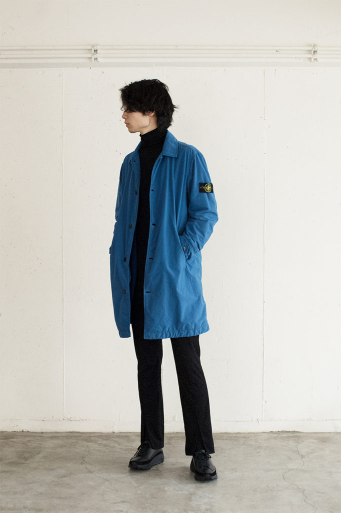 コート¥125,000+TAX(STONE ISLAND/ストーンアイランド)、セーター¥16,000+TAX(LE/レショップ 青山店)、パンツ¥32,000+TAX(TA CA SI/インターナショナルギャラリー ビームス)、シューズ¥33,000+TAX(YOAK/ヘムトPR)