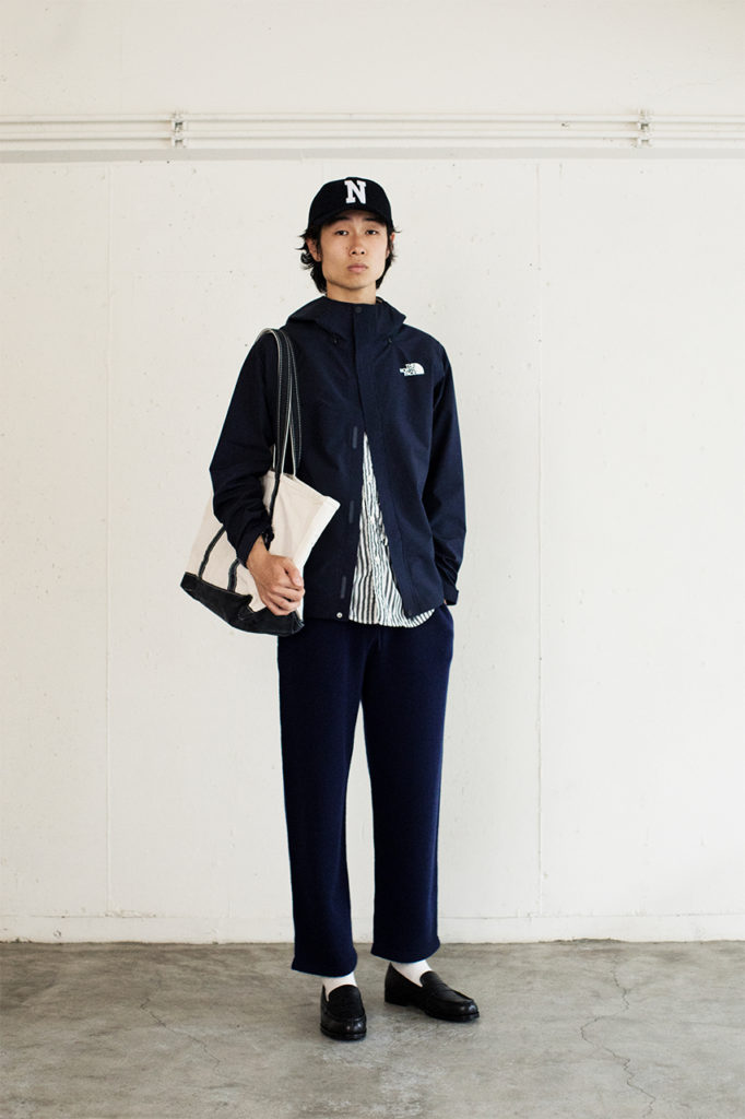ブルゾン¥27,000+TAX、キャップ¥5,000+TAX(THE NORTH FACE/株式会社ゴールドウィン カスタマーサービスセンター)、シャツ¥18,500+TAX(CAL O LINE/ユナイト ナイン)、カシミヤスウェットパンツ¥90,000+TAX(HERILL/アンシングス)、シューズ¥34,000+TAX(FOOTSTOCK ORIGINALS/ギャラリー・オブ・オーセンティック)、バッグ¥15,000+TAX(REMI RELIEF × L.L.Bean/ユナイト ナイン オンラインストア)