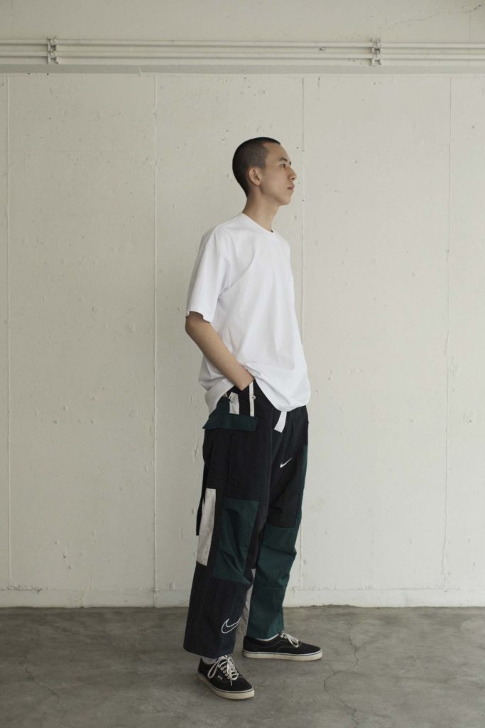 Tシャツ¥5,500+TAX (MINE/マイン)、ナイロンパンツ¥38,000+TAX (OLD PARK / ヘムトPR)、その他スタイリスト私物