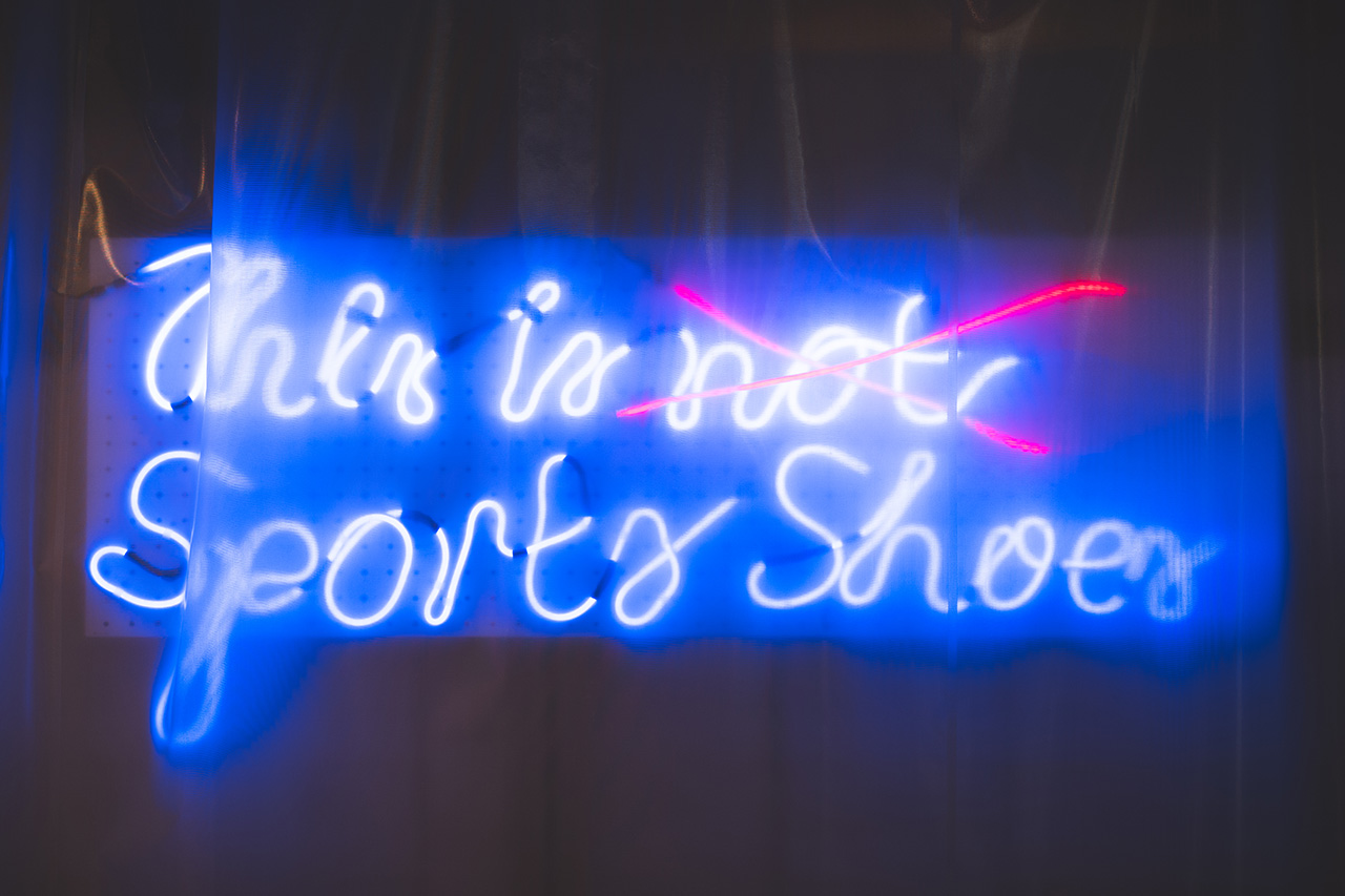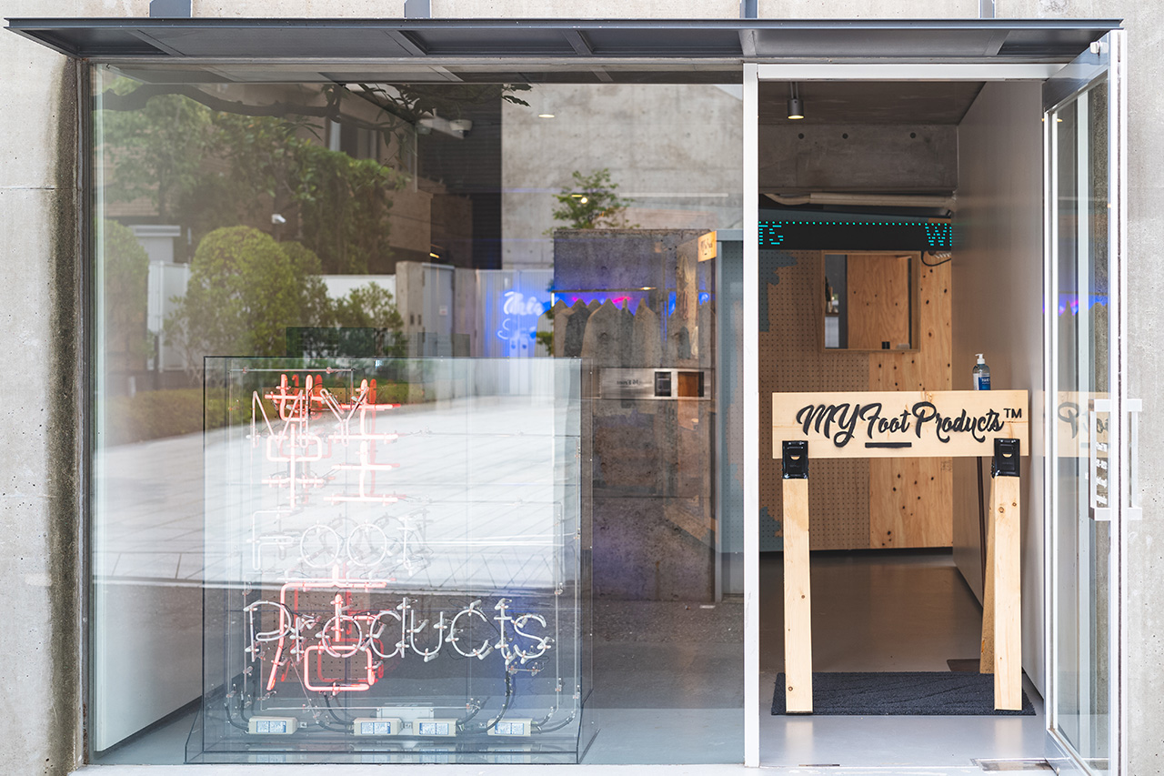 「マイ・フット・プロダクツ」の店舗自体はそこまで広くはないが、店内に並んでいるのはごく少量のスニーカーと、このショップ限定のアパレルのみなので、まるでギャラリーのような贅沢な空間になっている。入り口と店舗奥のネオンサイン、そしてディスプレイ什器も木製のプレハブのような簡素でシンプルなものが並んでおり、そこには虚飾を配した美意識が感じられる。