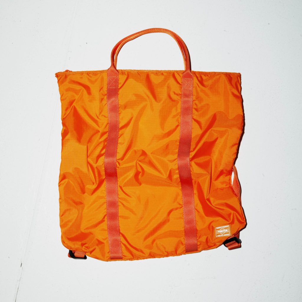 レジバッグの有料化に伴い、こうしたシンプルなトートバッグの良品を探している人が増えている。この“ポーター フレックス”シリーズは軽量で十分な強度もあり、デイリーな買い物バッグとしてもおすすめ。もちろんパッカブルなので、コンパクトに折り畳んでメインのバッグに忍ばせておけば、仕事帰りの買い物にも使えてしまう。このミリタリーテイストのあるビビッドなオレンジカラーはポーターオフィシャル オンラインストア限定色。