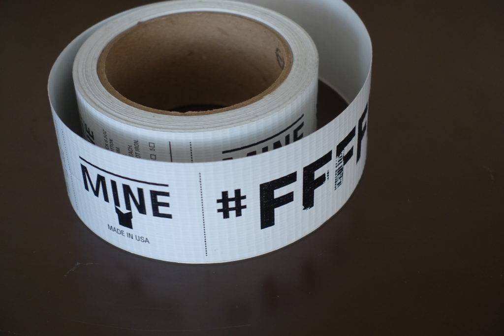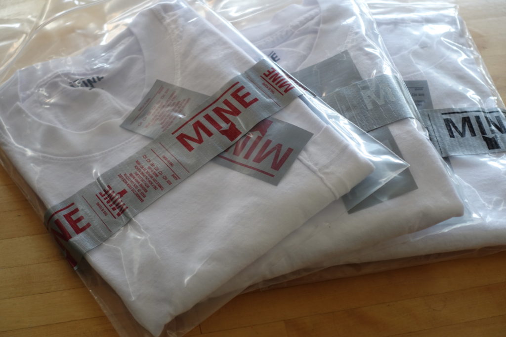 白いダクトテープも[MINE]のアイデンティティのひとつ。アメリカ製のオリジナルダクトテープを作れるルートがあるという。こちらは千駄ヶ谷の白T専門店「#FFFFFFT」とのコラボ用に作ったもの。