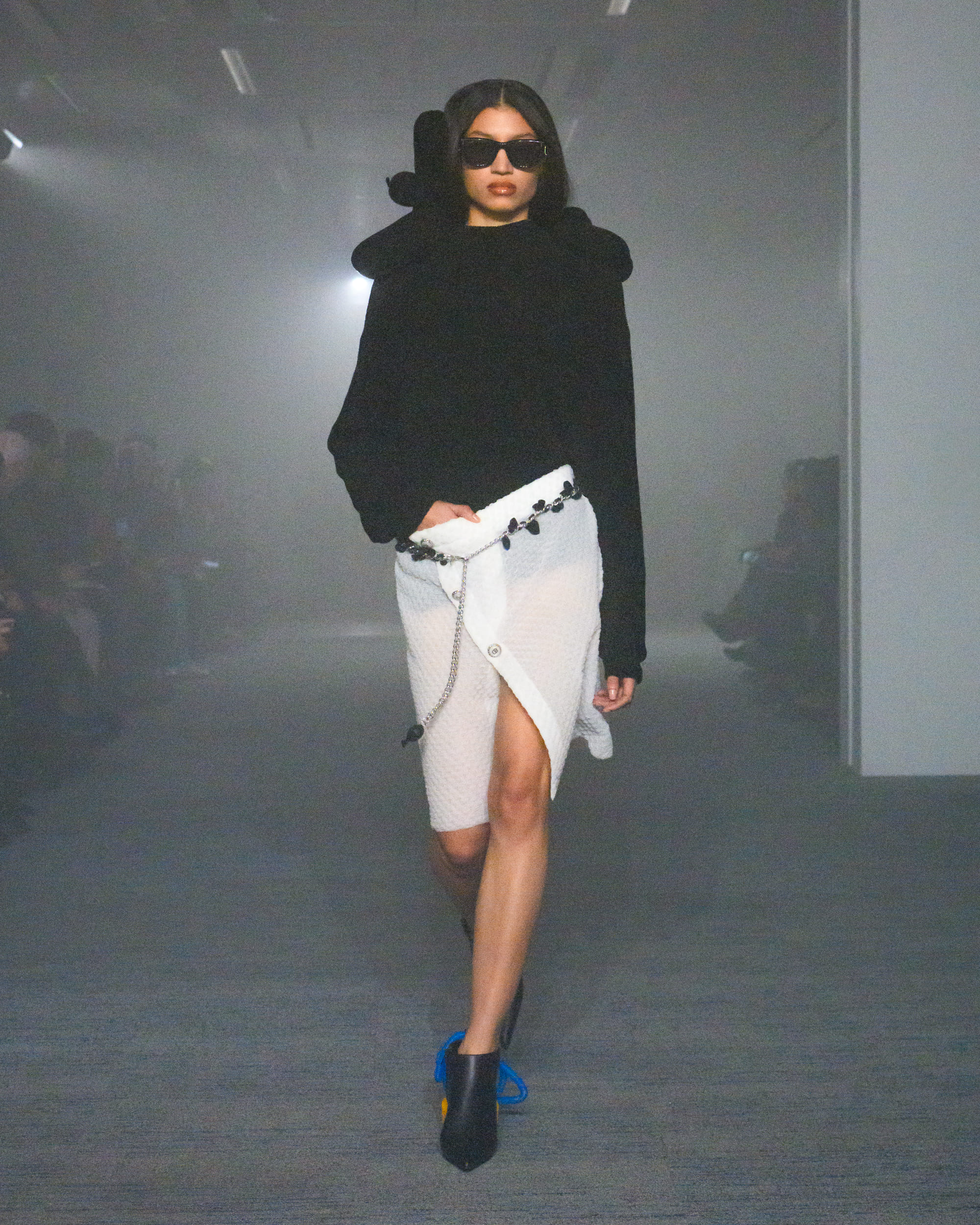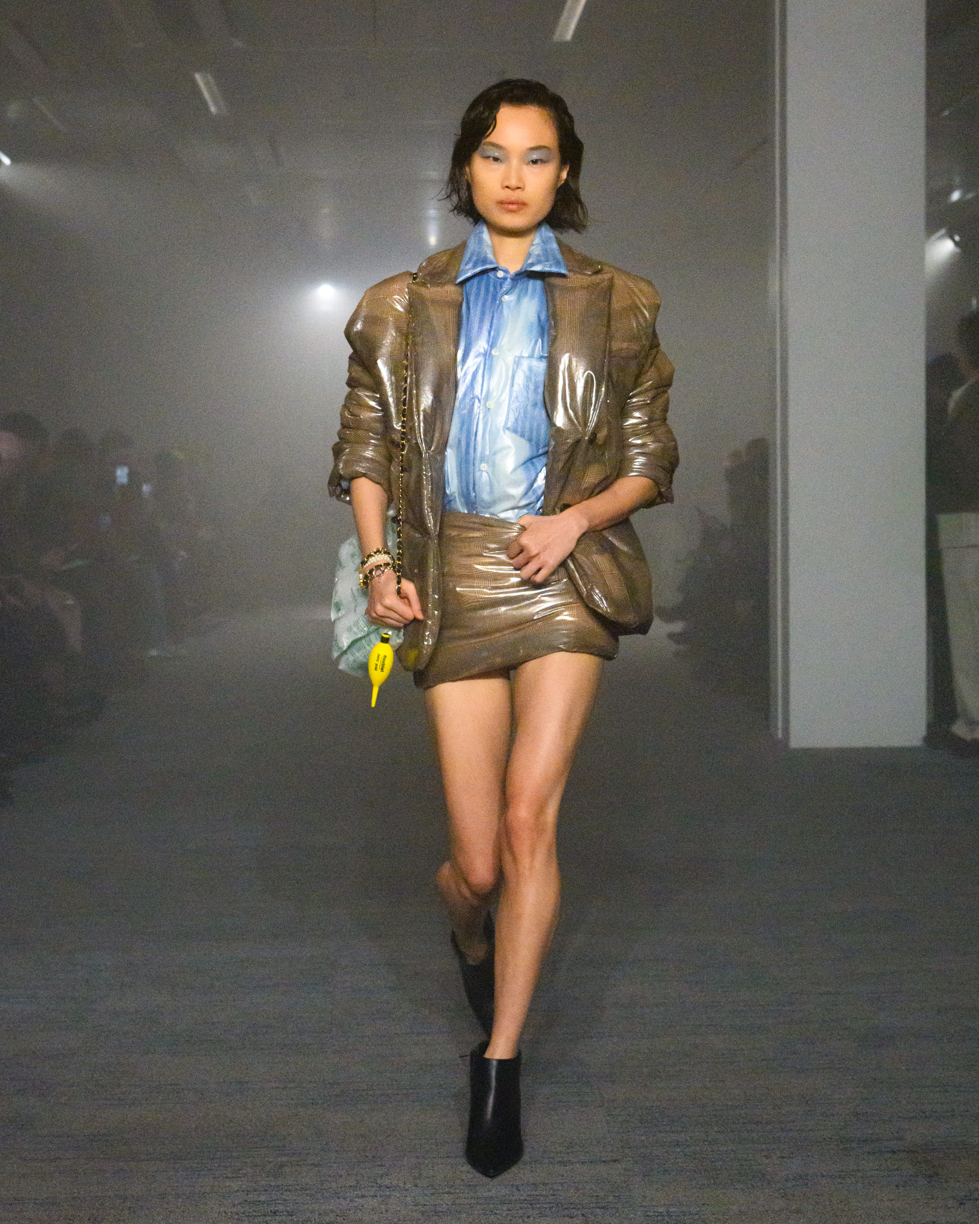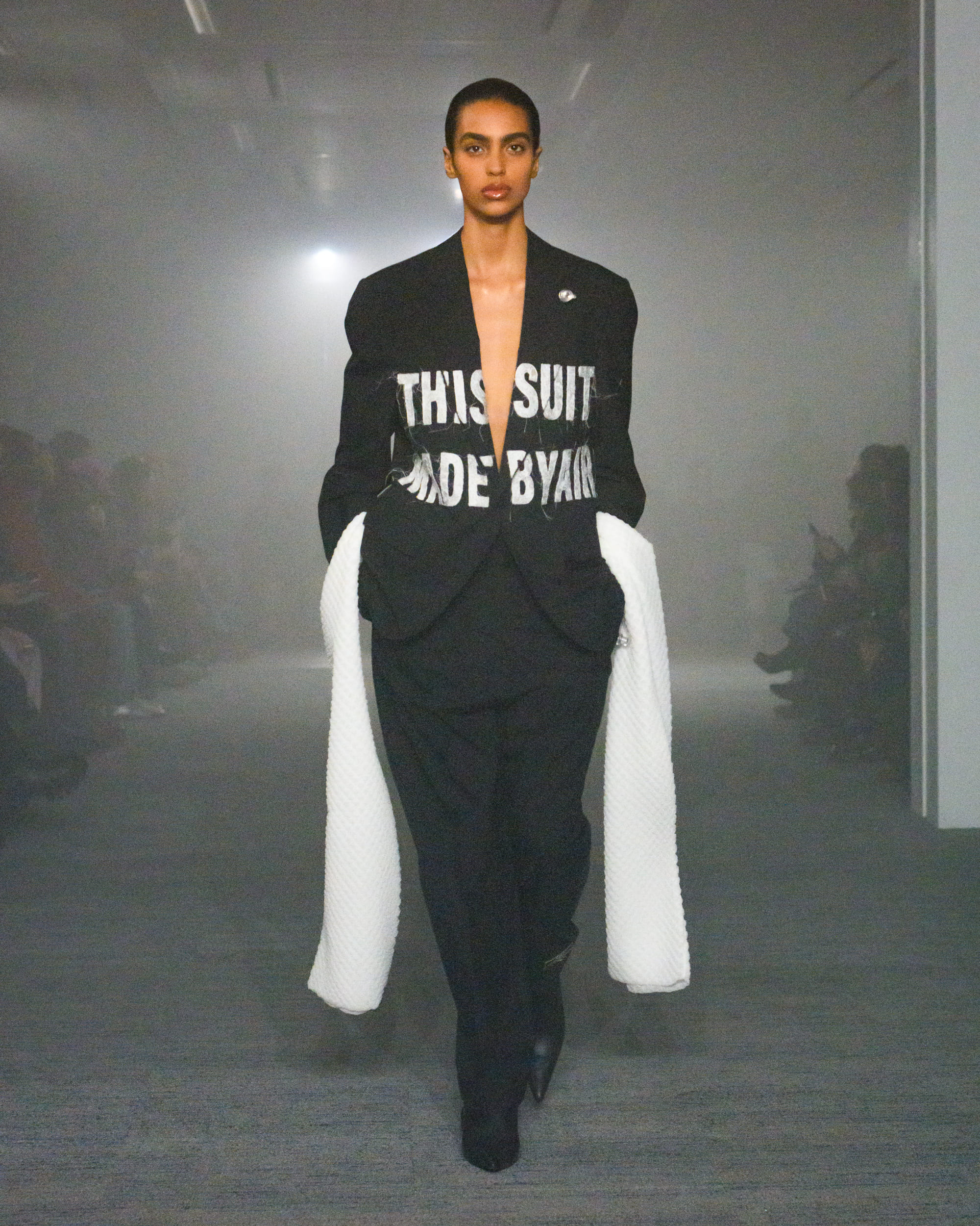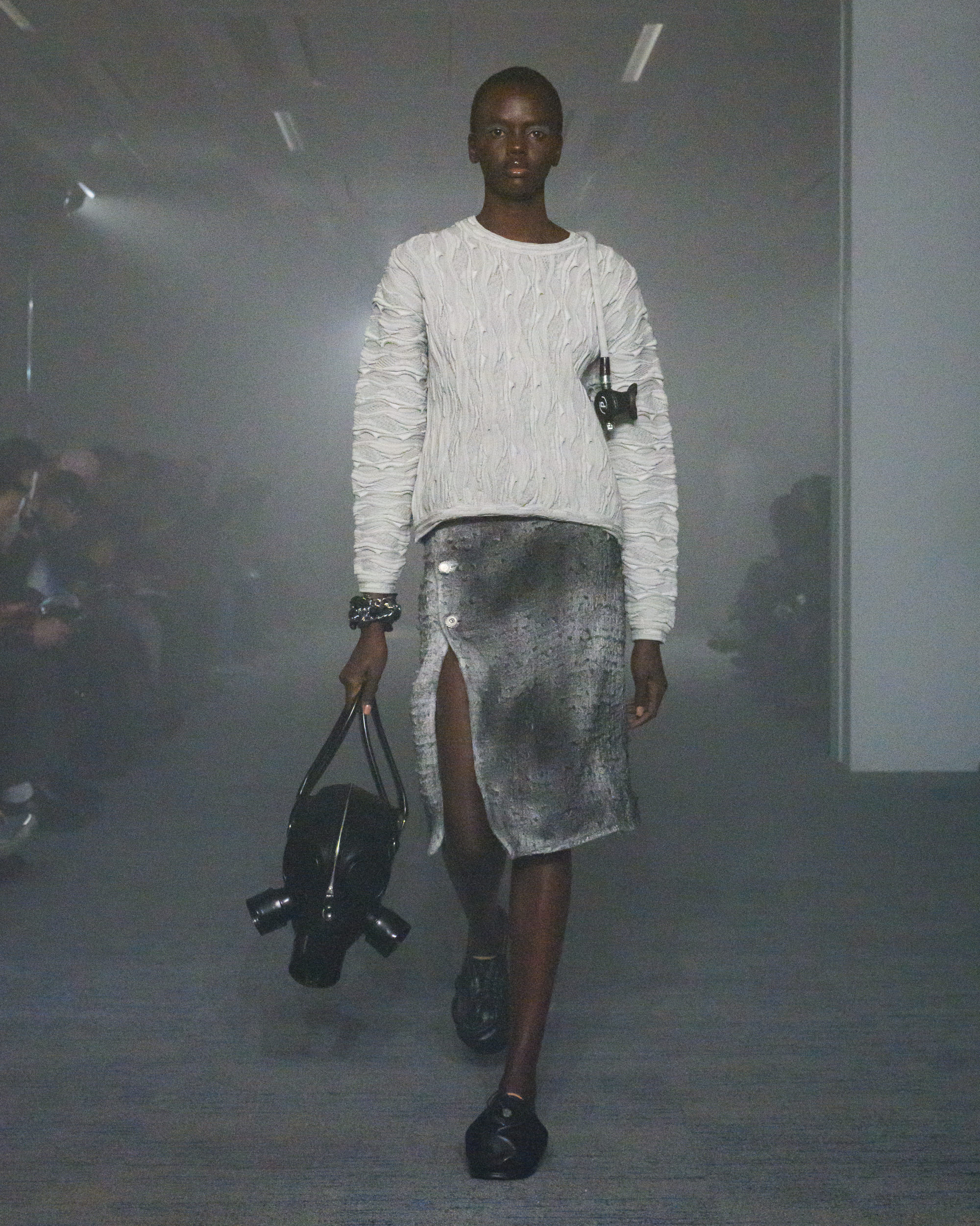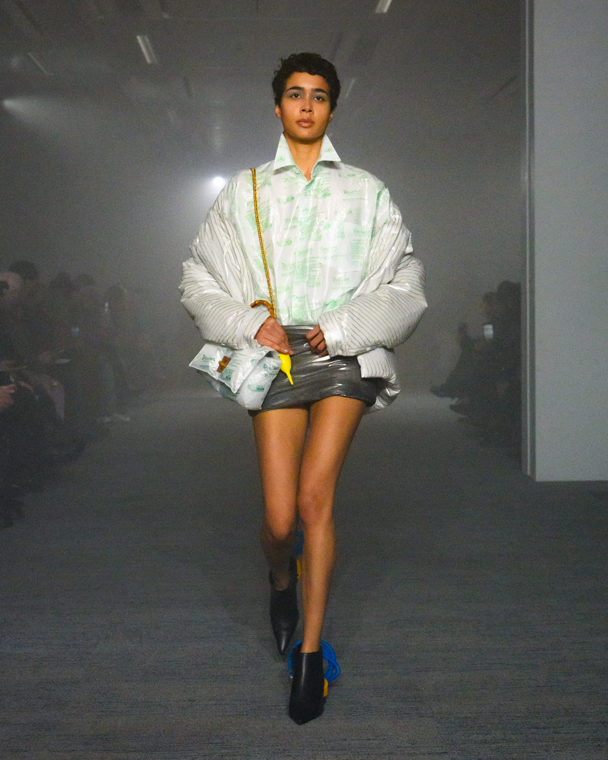 “AIR”と題されたコレクションでは、文字通り“空気から生まれた素材”として、CO2から生まれた糸、温室効果ガスを「食べる」微生物がつくるバイオベース樹脂、排気ガス由来の炭素を原料とするインクなどを採用。ユニークなデザインに目が行きがちではあるが、doubletは近年こうして環境に対して高い意識でコレクションに臨んでおり、今回もそれが発揮された形となった。