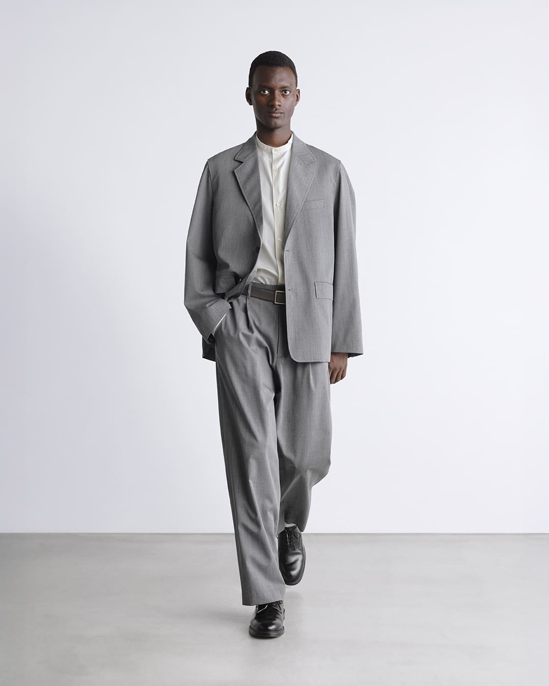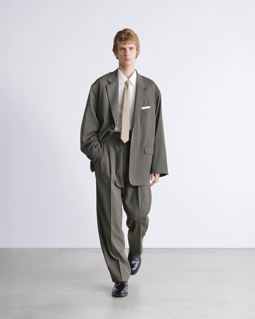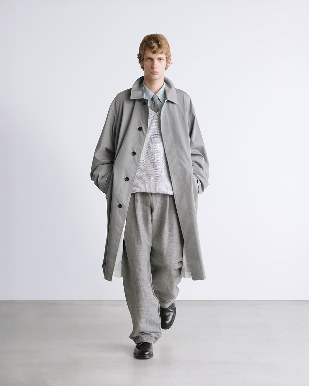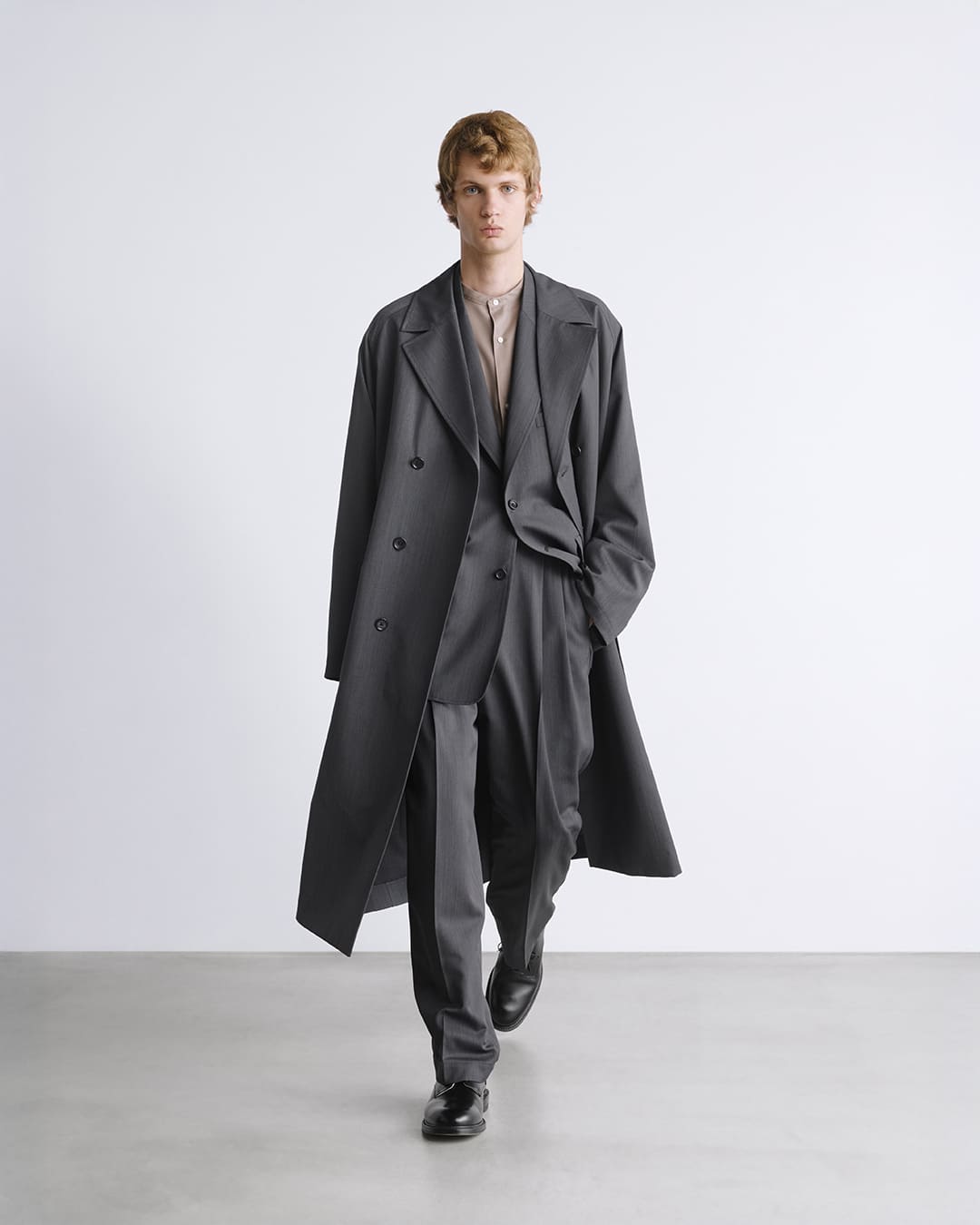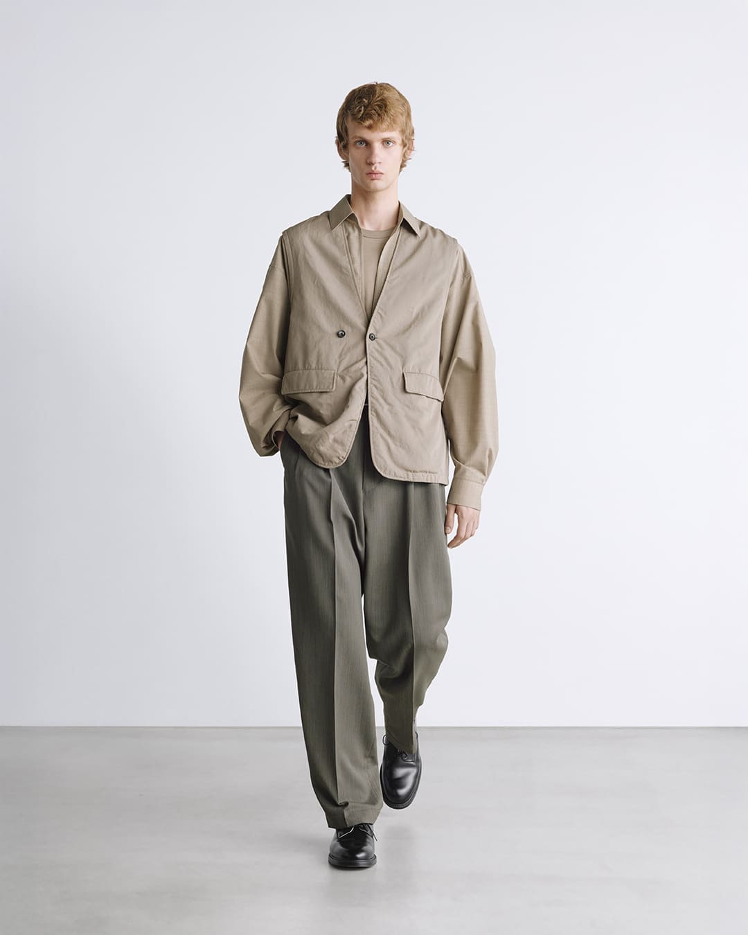 最新コレクションでは1980〜90年代に日常の装いの一部として存在したスーツやスラックスを、現代のシルエットと独自のミニマリズムで再解釈し、過去のドレスコードの残像を再構築。テーラリングの文脈を踏まえながらも、シルエットは緩やかに拡張され、重心やバランスが再考されている。