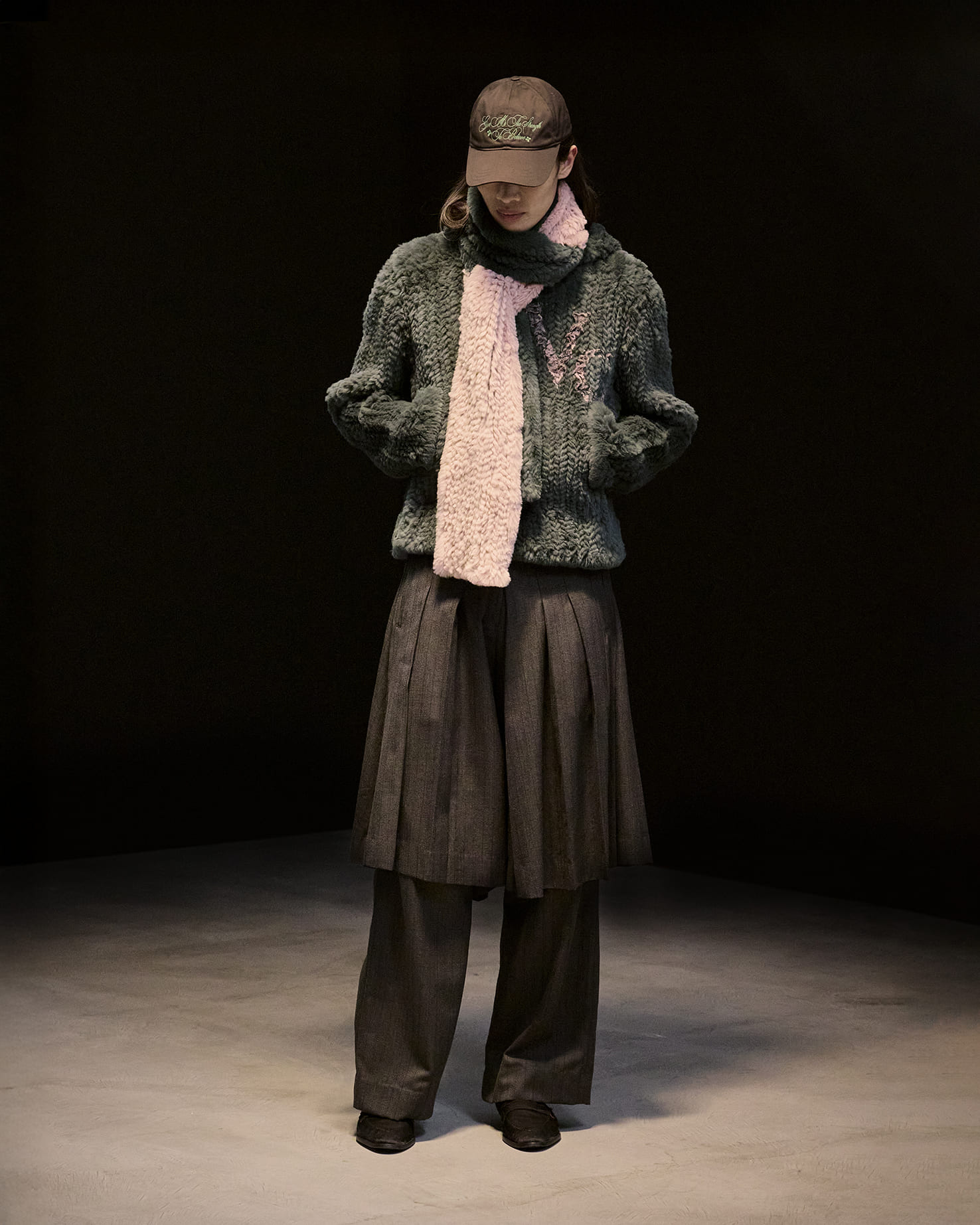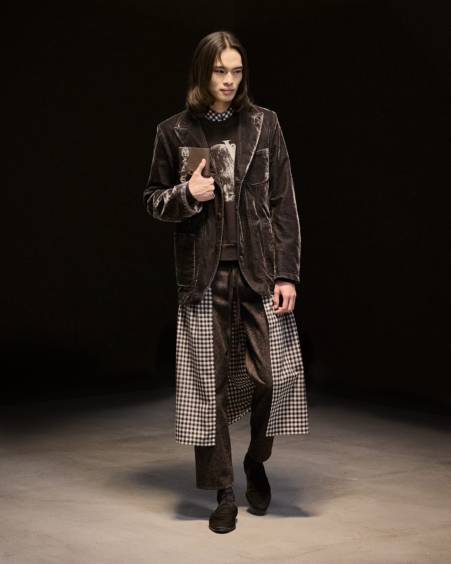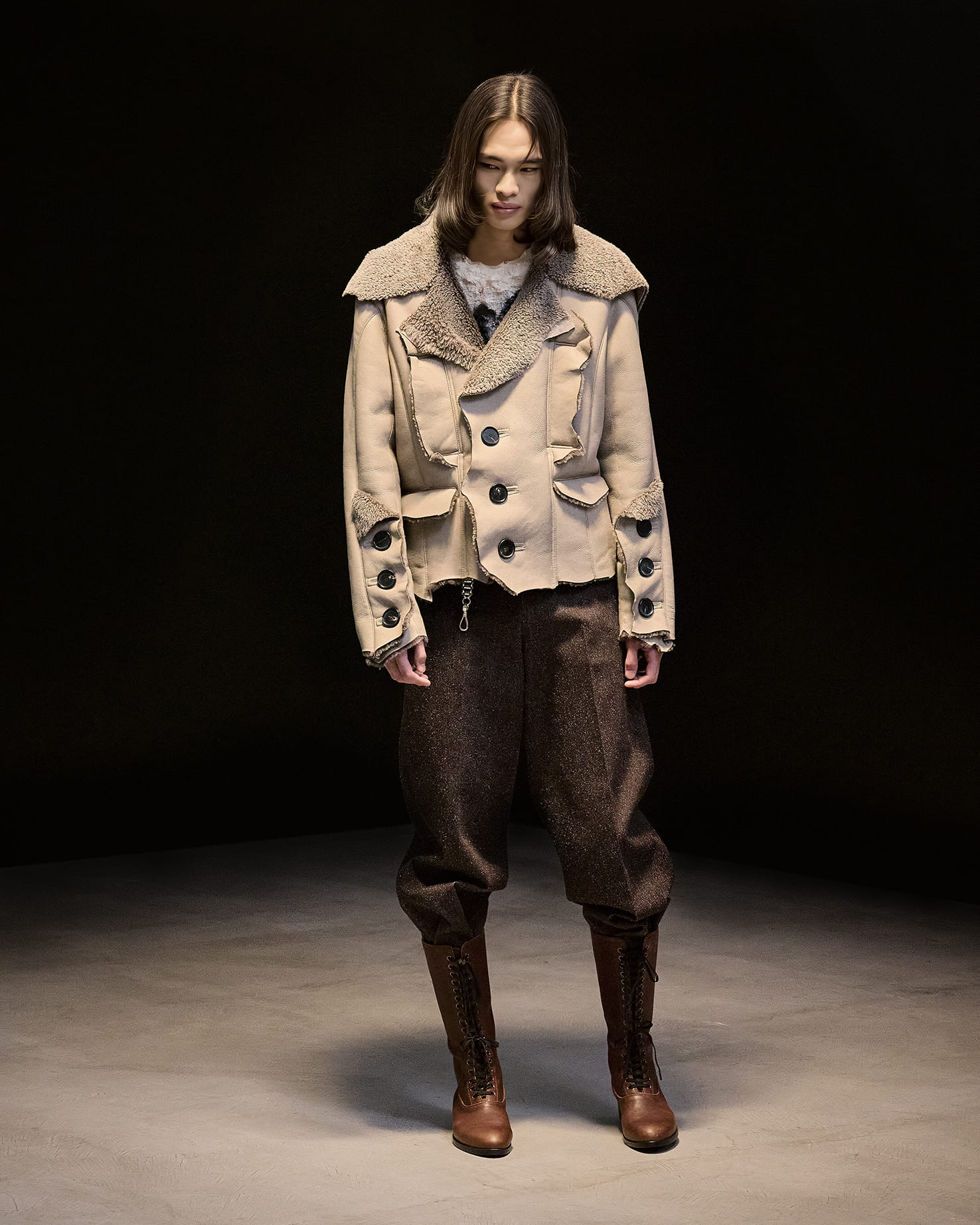 アーガイルセーター、ポップコーン素材のブルゾン、ベロア素材など、ブランドのアイコンとなっているアイテムもありながら、ヘリンボーンツイードのジャケット、クロップドデニム、スウェードのフライトジャケット、レーザーカットを駆使したアウターなど、それぞれに捻りが加えられつつ、自在な広がりを見せている。
