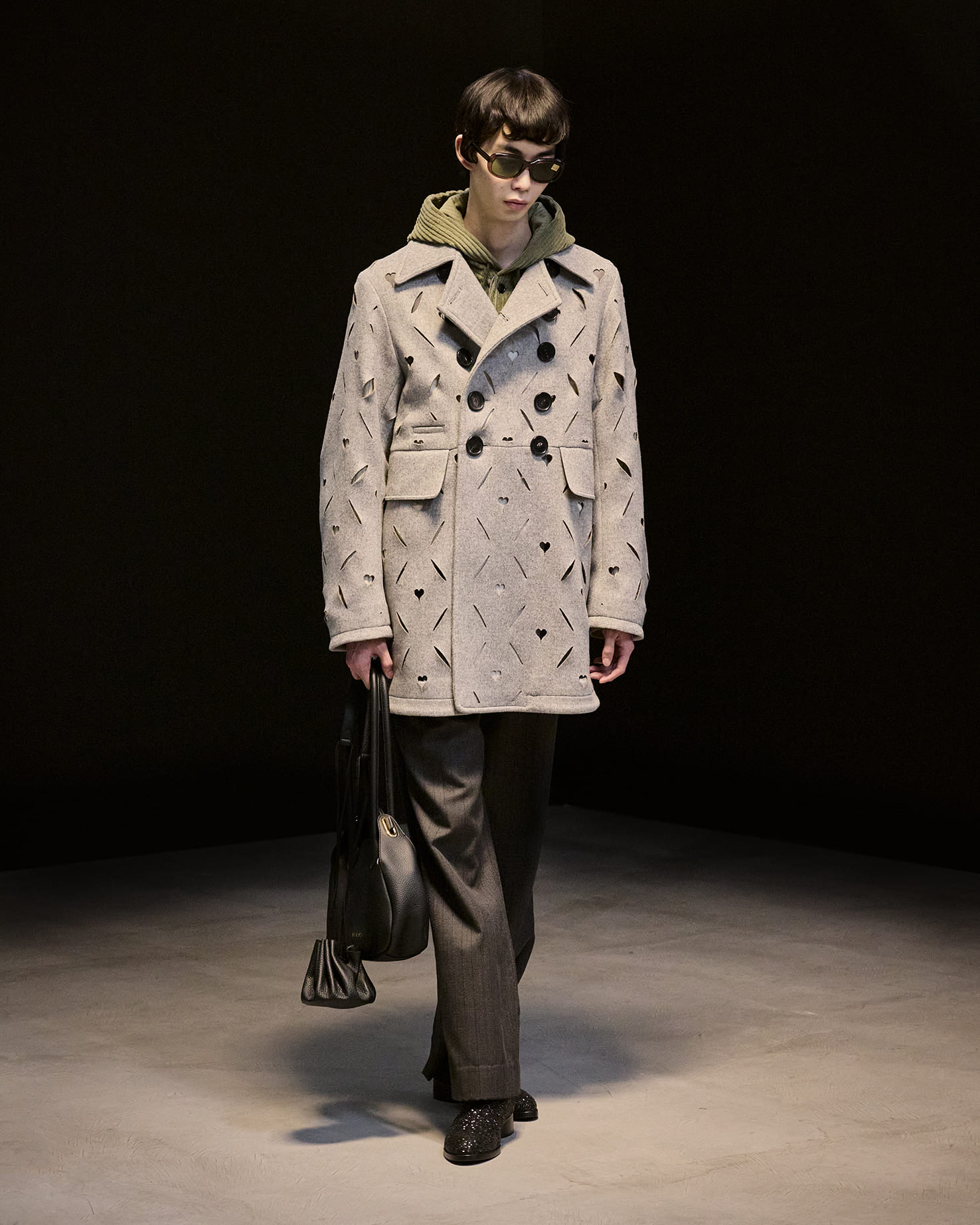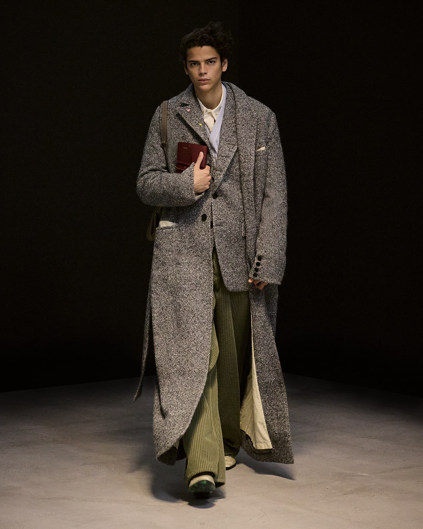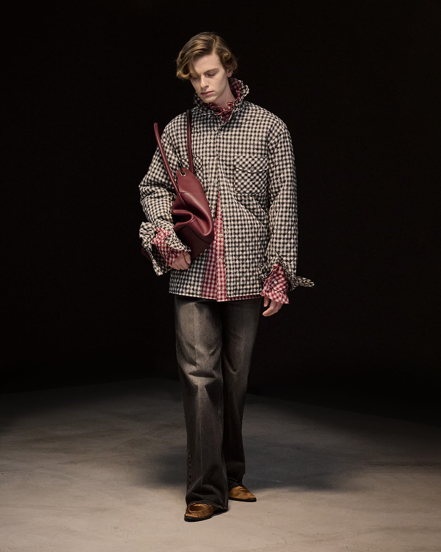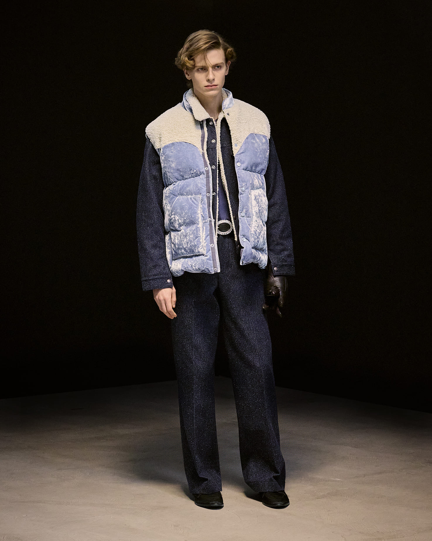 アーガイルセーター、ポップコーン素材のブルゾン、ベロア素材など、ブランドのアイコンとなっているアイテムもありながら、ヘリンボーンツイードのジャケット、クロップドデニム、スウェードのフライトジャケット、レーザーカットを駆使したアウターなど、それぞれに捻りが加えられつつ、自在な広がりを見せている。