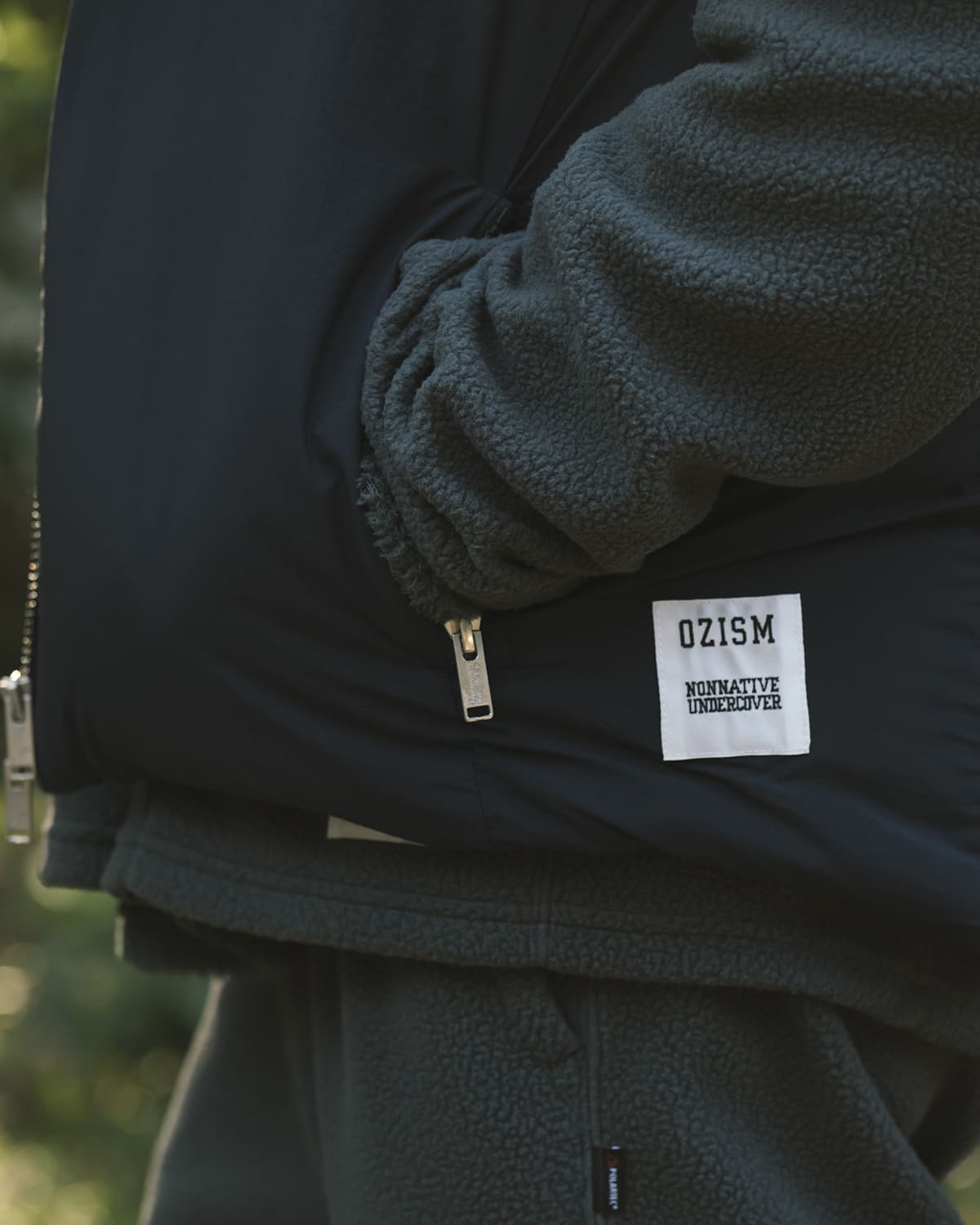 ここ数年継続している、藤井隆行氏が手がけるnonnative(ノンネイティブ)と高橋盾氏によるUNDRCOVER(アンダーカバー)のコラボレーションライン、OZISM(オジズム)。両デザイナーが個人的な親交があった中で、「普段着としての作務衣(さむえ)が欲しい」という私的な会話から始まったというこのプロジェクトでは、あえて日本的なデザインアプローチと機能的な素材をミックスすることで、新たな魅力のあるプロダクトを作り続けている。