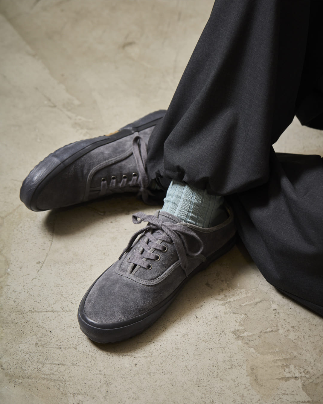 デッキシューズをベースに、上質なイタリアンスエードを採用してハンドメイドで仕上げたワントーンの一足は、ミリタリーの系譜がありながらも日常のスタイリングに馴染むデザインに。ソールには天然ラバーを多く配合した柔軟で耐久性のあるラバーソールを用い、高いグリップ力を持つソールパターンを採用している。